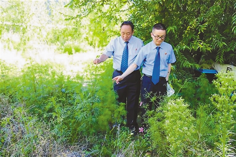 朗縣人民檢察院在辦理督促防治外來物種印加孔雀草行政公益訴訟案期間,檢察官對印加孔雀草的生長區域進行摸排。