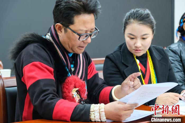 1月9日,西藏自治區兩(liang) 會(hui) 現場,兩(liang) 位珞巴族政協委員林勇(左)和布姆曲珍進行討論、交流。中新社記者 江飛波 攝