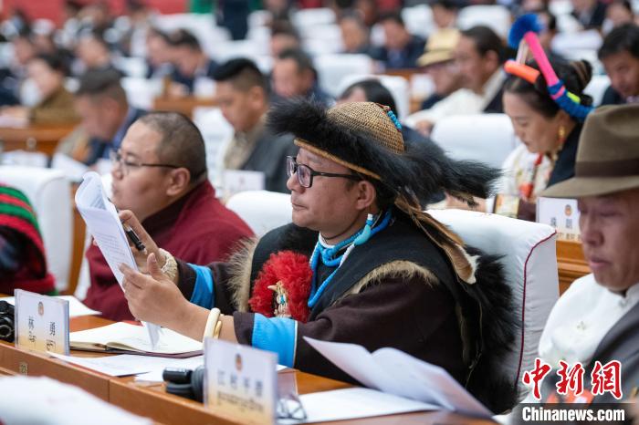 1月6日,西藏自治區兩(liang) 會(hui) 現場,珞巴族政協委員林勇(中間者)參會(hui) 。中新社記者 貢嘎來鬆 攝