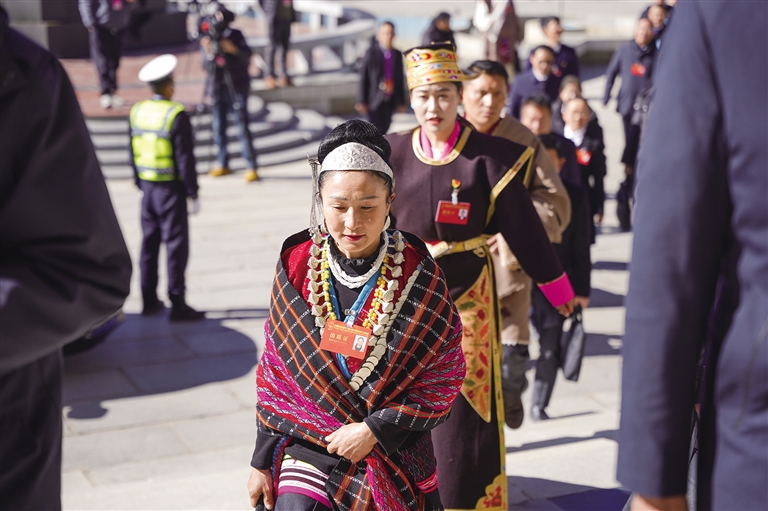 身著民族服飾的人大代表步入閉幕會(hui) 場。