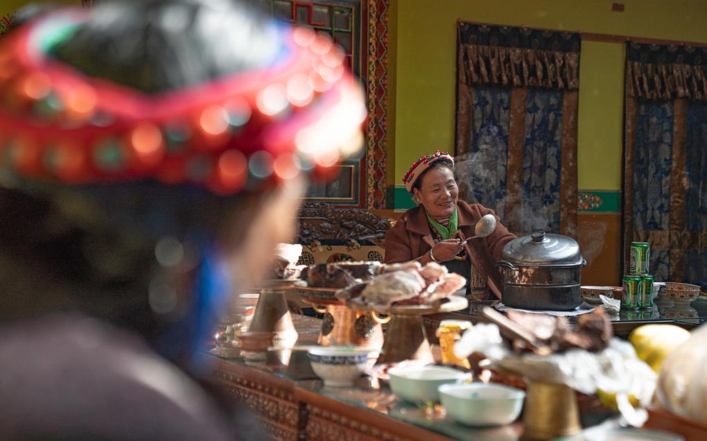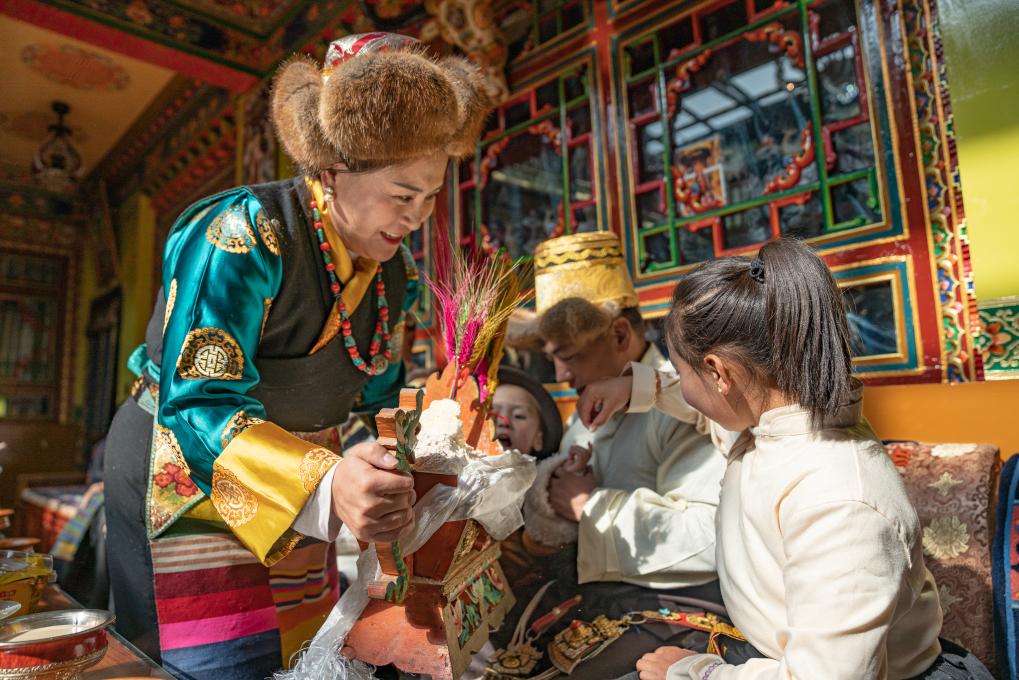 一家人按長幼次序落座,女兒(er) 次仁普尺逐一為(wei) 大家獻上切瑪,這也是新年的重要儀(yi) 式,寓意五穀豐(feng) 登、六畜興(xing) 旺、家和萬(wan) 事興(xing) 。