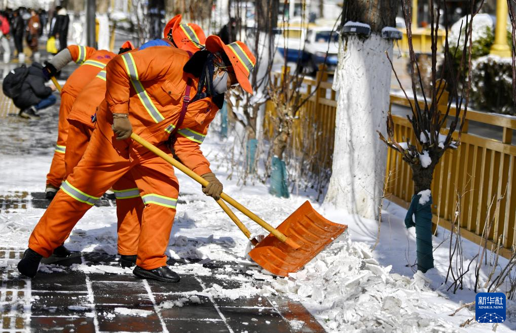 1月18日,環衛工人在清理拉薩街道上的積雪。新華社記者 張汝鋒 攝