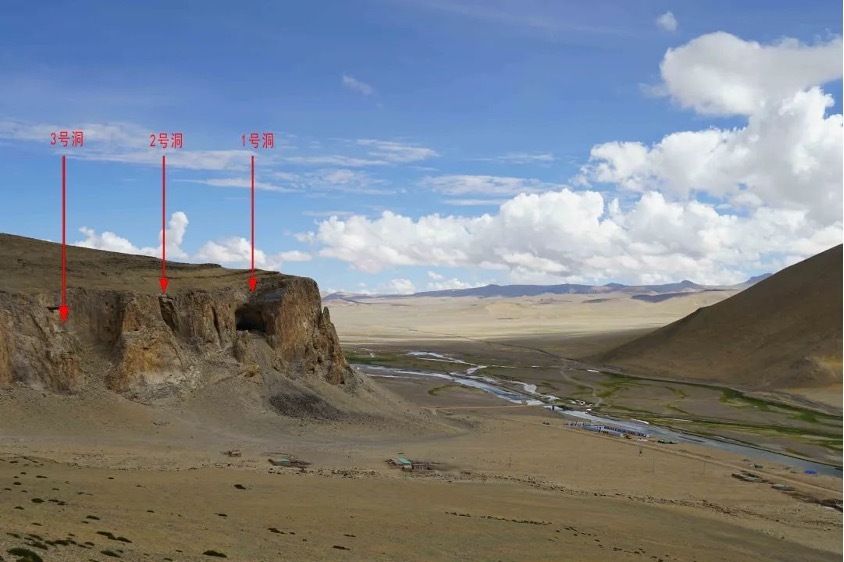 梅龍達普洞穴地處藏北羌塘高原西部地區,位於(yu) 革吉縣城南約30公裏、獅泉河上遊左岸的石灰岩山體(ti) 上,洞口位置高出獅泉河水平麵104米。梅龍達普,藏語意為(wei) “腰間的鏡子”,由一字排開的三個(ge) 獨立洞穴組成:一號洞規模宏大,麵積超過1000平方米;二號洞規模較小,麵積約60平方米;三號洞,規模最小,麵積約25平方米。
