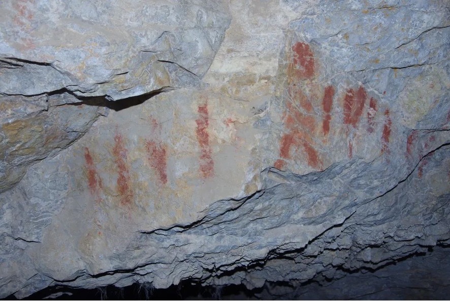 該洞穴的史前文化遺存,於(yu) 2018年7月在西藏自治區文物保護研究所和中國科學院古脊椎動物與(yu) 古人類研究所聯合組織的舊石器考古調查中發現。經國家文物局批準,2018-2023年期間,考古隊連續開展了6個(ge) 年度的正式考古發掘。 除了發現上萬(wan) 件各類文化遺物,一號洞壁還發現了排列有序的豎條紋、人形輪廓、手掌以及太陽等以紅色赭石繪製的岩畫。