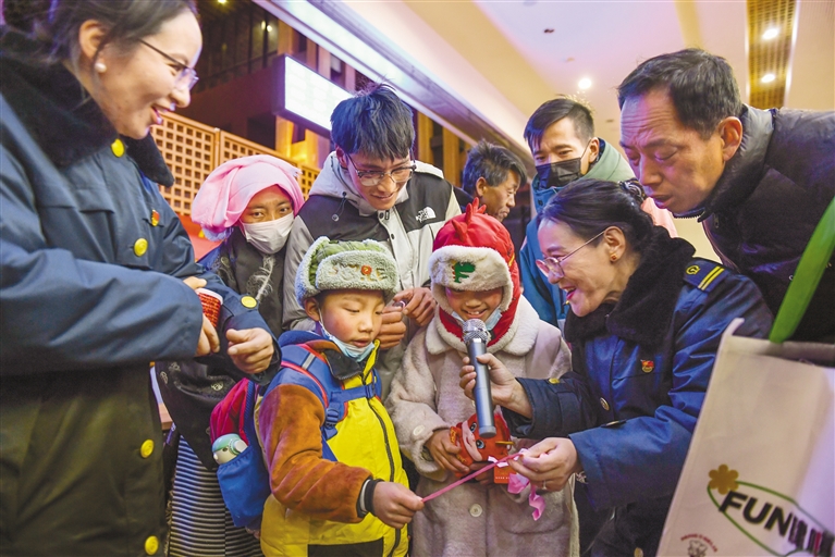 春運首日,拉薩火車站候車大廳開展新春猜謎活動,為(wei) 參與(yu) 活動的旅客送上新年伴手禮。記者 丹增群培 攝