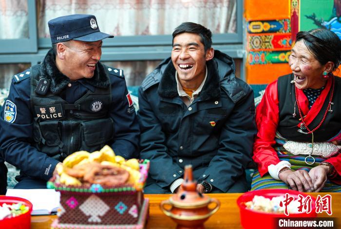 圖為(wei) 崗巴邊境派出所民警嘎色與(yu) 若木新村老百姓分享收獲的喜悅。葉軼 攝