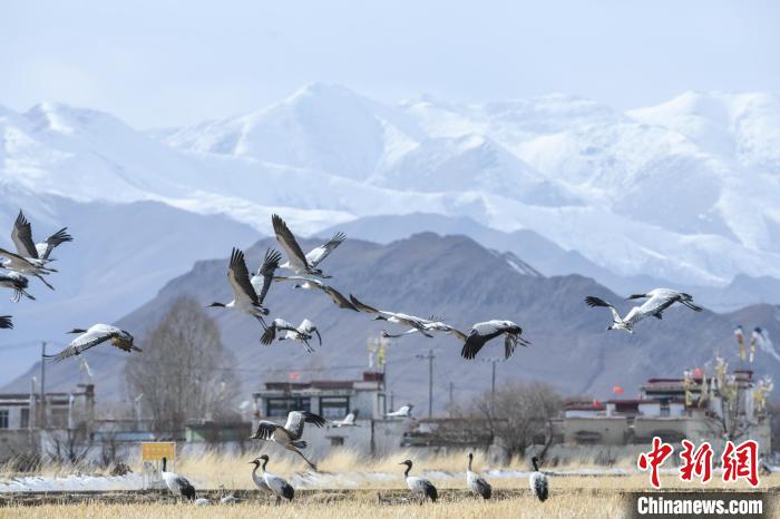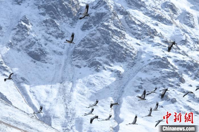 圖為(wei) 拉薩林周縣黑頸鶴保護區內(nei) ,黑頸鶴在雪山翱翔。貢嘎來鬆 攝