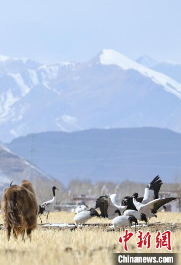 圖為(wei) 拉薩林周縣虎頭山水庫,黑頸鶴正在覓食、嬉戲。貢嘎來鬆 攝