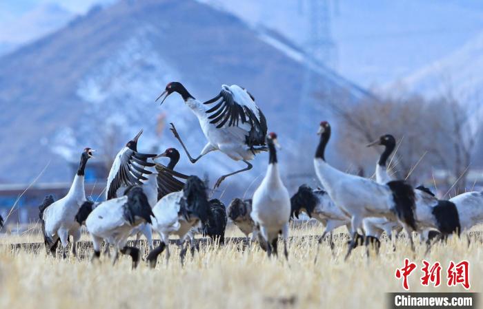 圖為(wei) 拉薩林周縣黑頸鶴保護區內(nei) ,黑頸鶴正在覓食、嬉戲。貢嘎來鬆 攝