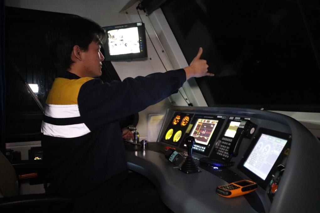 在作業(ye) 平台上,工人自主調試平台的高度、角度,通過長短不同的喇叭聲通知作業(ye) 車司機前進、後退或停止。隨著上方傳(chuan) 來一長一短兩(liang) 聲喇叭,55歲的作業(ye) 車司機呂天鵬默契地向前行駛,讓平台剛好接近需要檢查的吊弦。