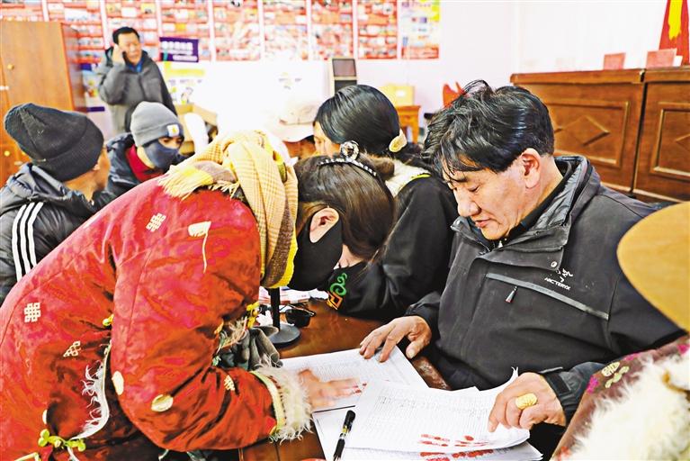 圖為(wei) 圓夢新居社區群眾(zhong) 有序排隊、簽字、按手印,準備領取分紅。記者 達珍 永青 攝