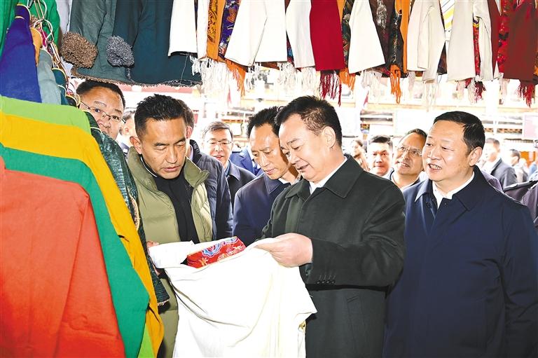 在小昭寺內(nei) 院、主殿,王君正詳細了解駐寺工作、消防安全措施落實等情況。指出,要加強和創新寺廟管理,融管理於(yu) 服務,紮實細致做好引導、服務、管理等工作,依法維護寺廟的正常秩序。大昭寺、小昭寺是全國重點文物保護單位,消防安全責重如山,要高度重視寺廟消防和文物安全工作,加快智慧消防建設,全麵提升文物保護、消防安全水平。冬日暖陽鋪灑廣場,購置年貨的人群熙熙攘攘,放眼望去一派熱鬧景象。王君正與(yu) 遊客親(qin) 切交談,並祝他們(men) 在拉薩玩得開心愉快。“生意好不好?每個(ge) 月多少收入?”王君正隨機走訪沿街商戶,向銷售人員、購物群眾(zhong) 詢問商品價(jia) 格、市場需求等情況,了解到店鋪每日收入3000餘(yu) 元時,王君正叮囑商戶抓住市場機遇,靈活經營、做大銷量,並祝願他們(men) 在新的一年生意興(xing) 隆、生活幸福。