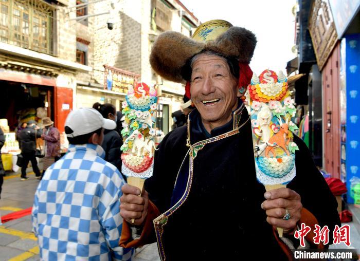 圖為(wei) 手工藝人傑布展示製作完成的酥油花。李林 攝