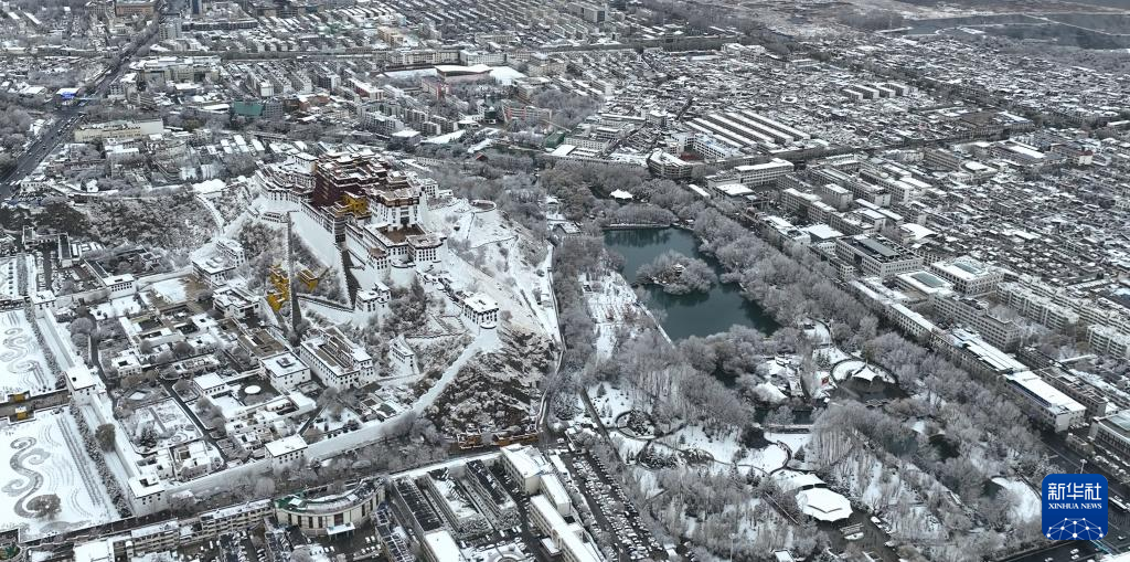 2023年12月8日,雪後的布達拉宮及其後的“宗角祿康”龍王潭公園(無人機照片)。新華社記者 洛卓嘉措 攝