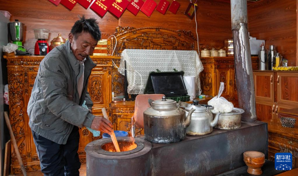 頓珠次旺在家裏燒爐子取暖。新華社記者 旦增尼瑪曲珠 攝