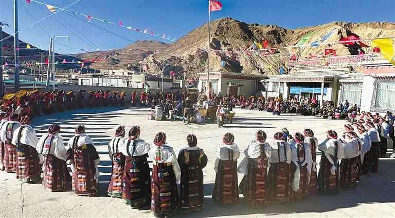 新春佳節,日喀則市聶拉木縣門布鄉(xiang) 門卡麥村的村民們(men) 身著華麗(li) 的服飾翩翩起舞,以飽滿的熱情將“甲諧”(意為(wei) 隆重的歌舞表演)的獨特魅力展現得淋漓盡致,以此來慶賀新年的到來。 圖為(wei) 演出現場。西藏日報記者 格桑倫(lun) 珠 攝
