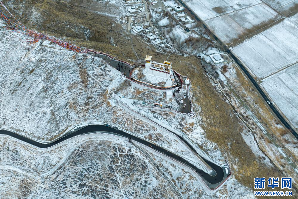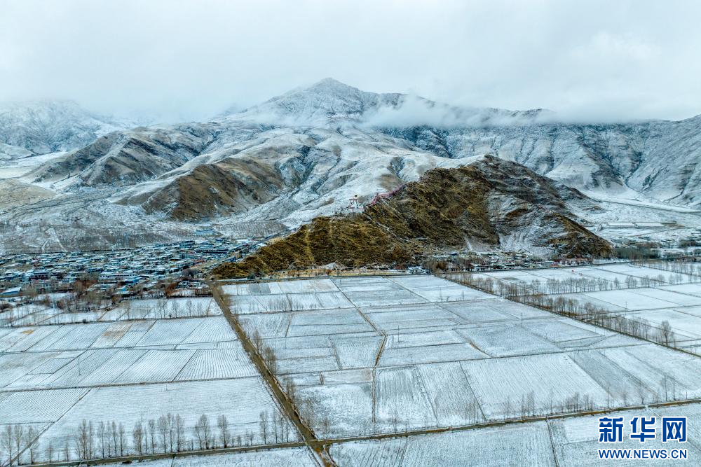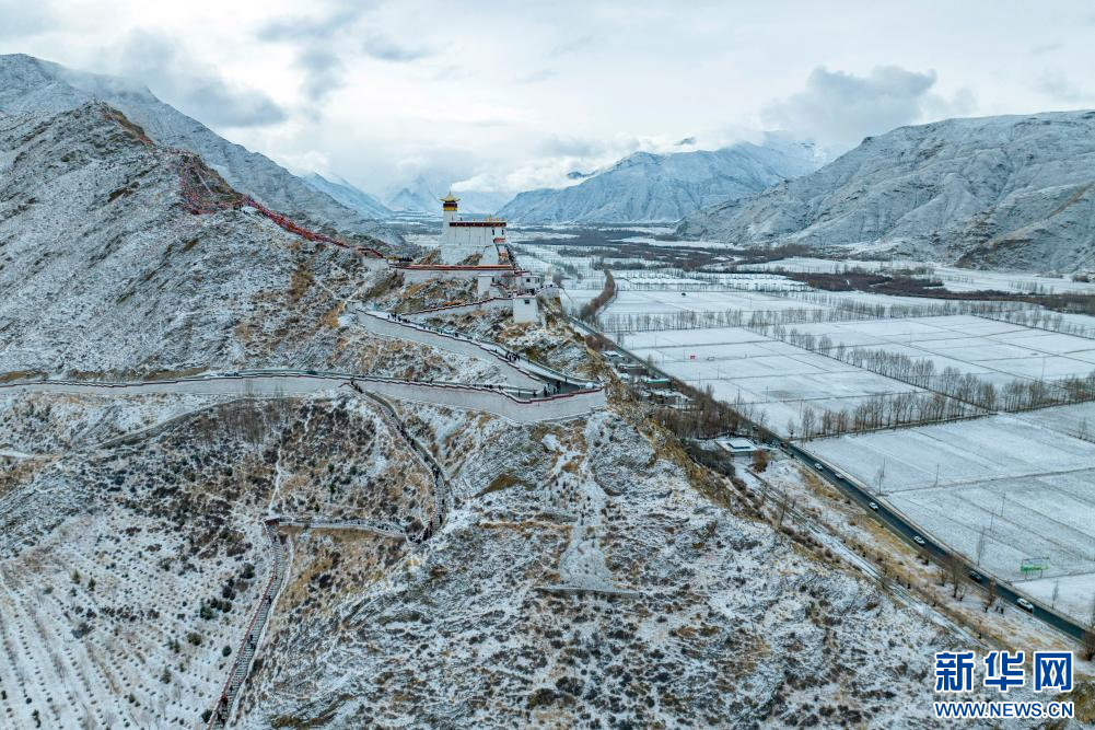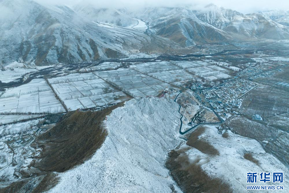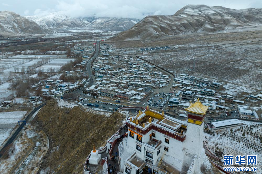 2月15日拍攝的雪後雍布拉康和山腳下的村莊(無人機照片)。新華網 旦增努布 攝