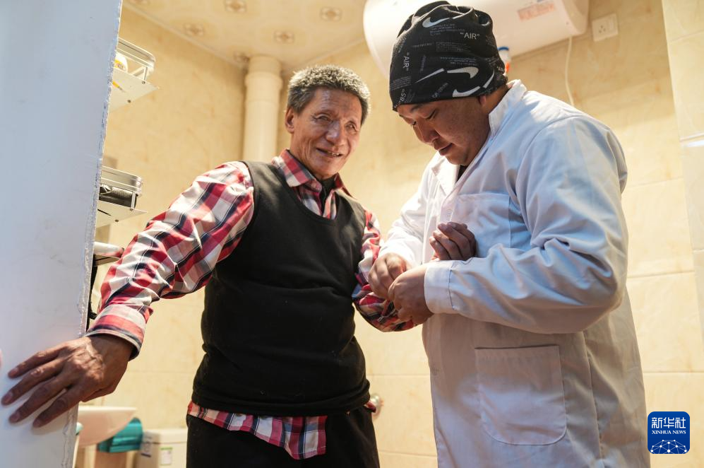 服務中心工作人員在幫助失明老人洗漱(1月30日攝)。新華社記者 晉美多吉 攝