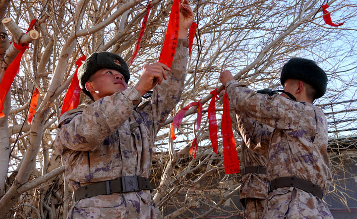 新春佳節來臨(lin) 之際,阿裏軍(jun) 分區某邊防團紮西崗邊防連戰士在“先遣柳”前懸掛心願布帶,寄語新年祝福(2024年1月17日攝)。新華社記者 陳尚才 攝