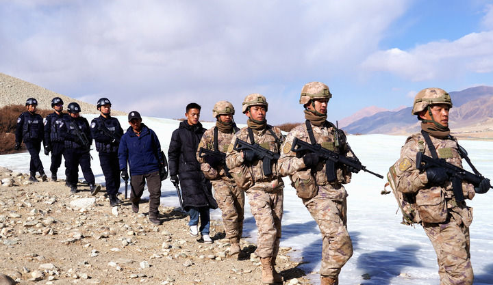 在西藏阿裏地區噶爾縣紮西崗鄉(xiang) ,黨(dang) 政軍(jun) 警民等力量在邊境地區巡邏(2024年1月17日攝)。新華社記者 陳尚才 攝