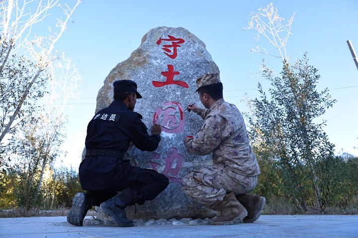 阿裏軍(jun) 分區某邊防團紮西崗邊防連戰士和移民管理警察共繪固邊石碑(2023年9月27日攝)。新華社發(李思鑫 攝)