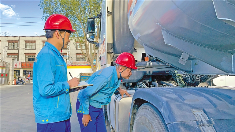 中國石油運輸西藏分公司工作人員在對油罐車輛進行安全檢查。記者 次仁平措 通訊員 格桑旦增 攝