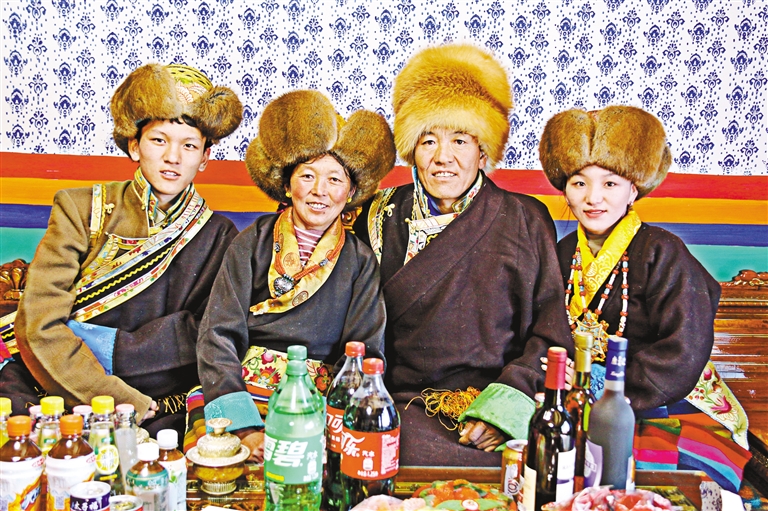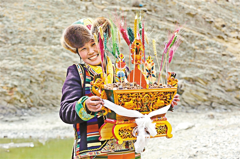 製作“切瑪”盒是藏曆新年一項曆史悠久的習(xi) 俗,代表著群眾(zhong) 對五穀豐(feng) 登的美好期盼。圖為(wei) 瓊結縣唐布齊村群眾(zhong) 身著節日盛裝,端出精心製作的“切瑪”盒。