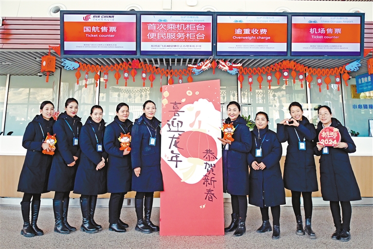 春運期間,西藏民航人為(wei) 廣大旅客架起歸途的平安天路,保障安全、順暢、高效出行。圖為(wei) 貢嘎機場旅服部工作人員在航站樓現場為(wei) 旅客送上新年祝福。