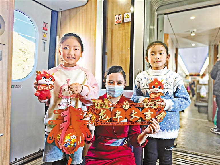 春運期間,鐵路部門踐行“天路格桑花”服務品牌理念,將車站、列車裝飾一新,為(wei) 旅客提供優(you) 質、貼心的服務。圖為(wei) 拉林鐵路動車組上的乘務員把龍年禮物送給孩子們(men) 。