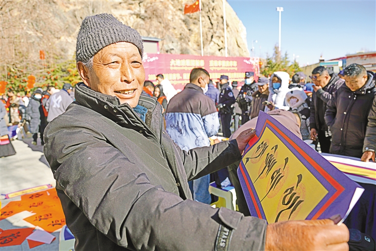 山南市文聯組織書(shu) 法家走進瓊結縣,開展“我們(men) 的中國夢——文化進萬(wan) 家”活動。圖為(wei) 群眾(zhong) 展示獲贈的藏文書(shu) 法作品。