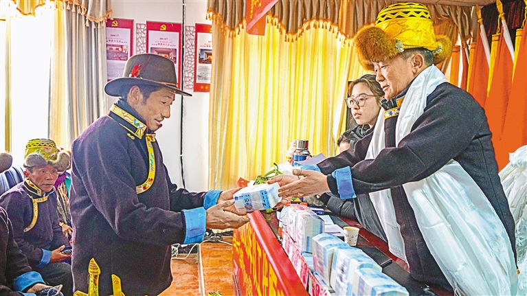 乃東(dong) 區頗章鄉(xiang) 布仁村2023年集體(ti) 經濟分紅款達30餘(yu) 萬(wan) 元,惠及全村101戶群眾(zhong) 。圖為(wei) 村民在領取分紅款。