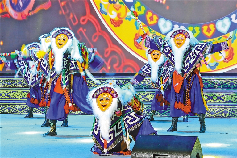洛紮縣組織縣藝術團、農(nong) 牧民表演隊等精心舉(ju) 辦“大地歡歌 美麗(li) 洛紮”村晚。圖為(wei) 村晚上的藏戲表演。