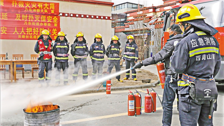 乃東(dong) 區消防救援大隊來到乃東(dong) 街道貢康社區,組織駐村工作隊、網格員、群眾(zhong) 開展消防應急演練,進一步提升群眾(zhong) 火災防範意識和應急處置能力。圖為(wei) 消防員正在指導群眾(zhong) 進行滅火實操。