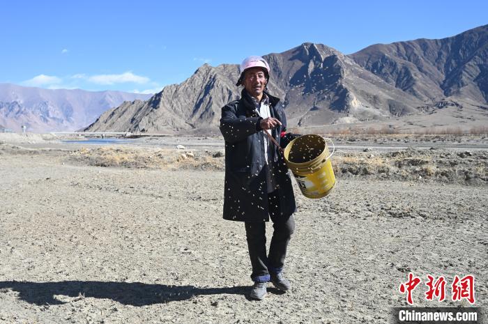 當日巡護,他帶了一些青稞補飼,嫻熟地灑在江邊的田地裏,不斷觀望是否有黑頸鶴的身影。他告訴中新網記者:“這是黑頸鶴常來的地方,你看還有一些羽毛,地裏還有很多爪印。”