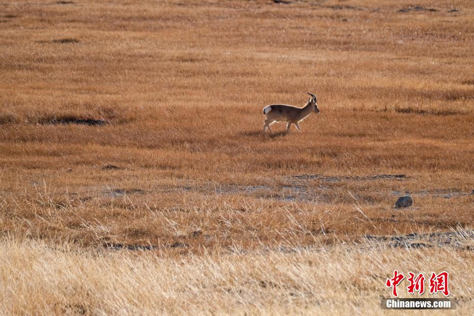 一隻藏原羚在羊卓雍錯湖畔濕地覓食。江飛波 攝