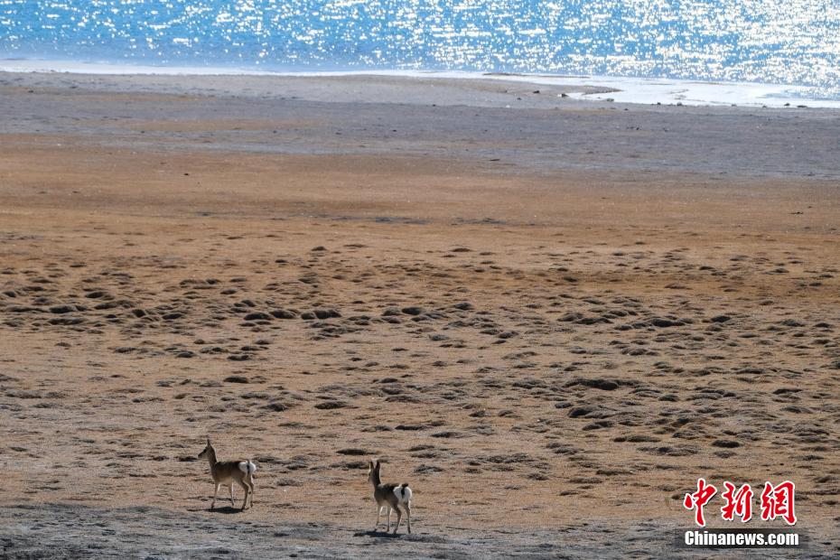 羊卓雍錯湖畔,兩(liang) 隻小藏原羚覓食。江飛波 攝