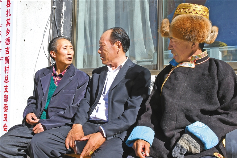 紮囊縣紮其鄉(xiang) 德吉新村,生活著藏族、漢族、土族等不同民族790餘(yu) 名群眾(zhong) ,該村先後榮獲縣級民族團結進步模範集體(ti) 、山南市民族團結進步模範單位、自治區民族團結進步模範村(居)等稱號,是山南市遠近聞名的“團結村”。 圖為(wei) 在德吉新村村委會(hui) 大院內(nei) ,祖籍青海,身著藏裝的村民張積成(右一),與(yu) 同村不同民族的群眾(zhong) 一起交談。記者 丹增平措 攝