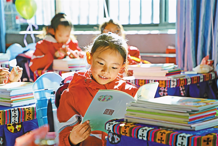 阿裏地區陝西實驗學校開學第一天,孩子們(men) 開心閱讀新課本。記者 洛桑旦增 達珍 永青 攝