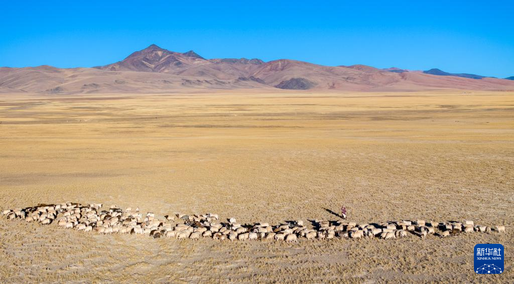 丹增在尼瑪縣俄久鄉(xiang) 馬遷村老家的草場上牧羊(無人機照片,2023年12月18日攝)。新華社 薑帆 攝
