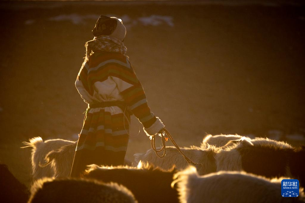 丹增在尼瑪縣俄久鄉(xiang) 馬遷村老家的草場上牧羊(2023年12月18日攝)。新華社 薑帆 攝