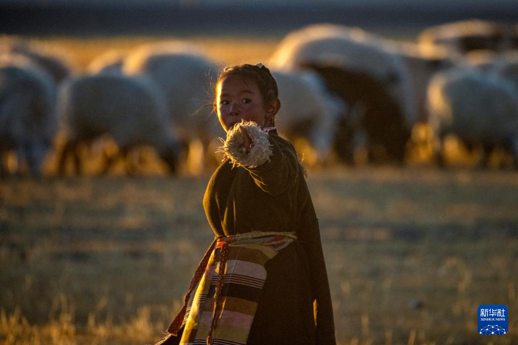 丹增4歲的小妹妹拉姆卓瑪在牧場上迎接姐姐趕羊入圈(2023年12月18日攝)。新華社 薑帆 攝