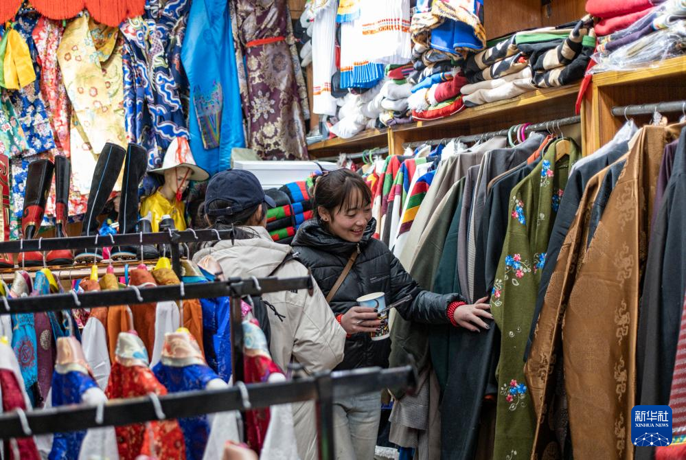在拉薩市中心的一家商店,丹增(右)和小姐妹們(men) 正在挑選商品(2024年1月27日攝)。新華社 孫非 攝