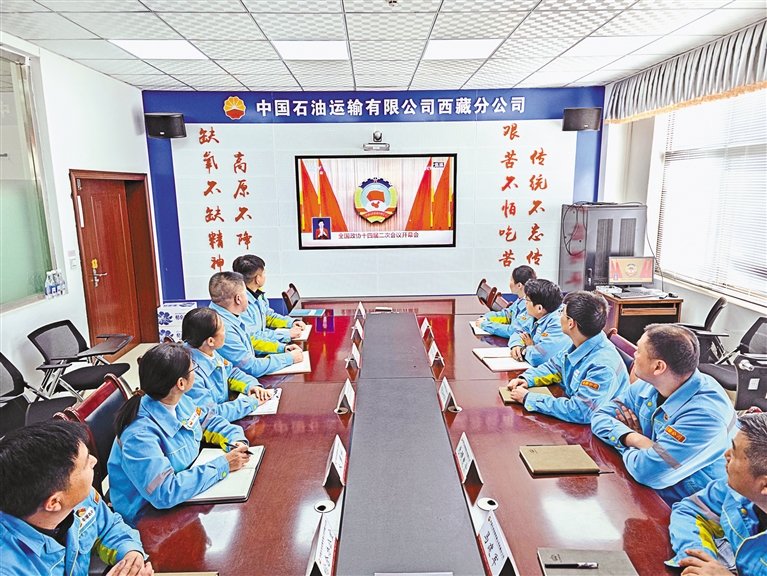 中國石油運輸西藏分公司組織員工收看全國政協十四屆二次會(hui) 議開幕會(hui) 。格桑旦增 記者 次仁平措 攝