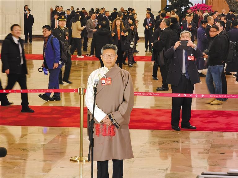 圖為(wei) 3月7日上午,全國政協十四屆二次會(hui) 議第二場“委員通道”集體(ti) 采訪活動開啟。圖為(wei) 住藏全國政協委員達瓦頓珠亮相“委員通道”並回答記者提問。