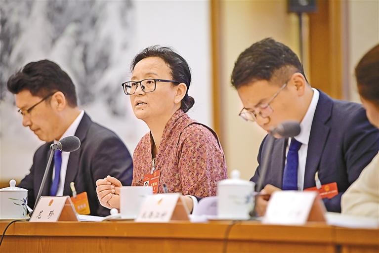 圖為(wei) 3月7日,西藏代表團舉(ju) 行全體(ti) 會(hui) 議,傳(chuan) 達學習(xi) 習(xi) 近平總書(shu) 記在看望參加全國政協十四屆二次會(hui) 議的民革、科技界、環境資源界委員並參加聯組會(hui) 議時的重要講話,審議國務院組織法修訂草案,繼續審查計劃報告和草案、預算報告和草案。圖為(wei) 尼珍代表在會(hui) 上進行討論發言。 旦增西旦 攝