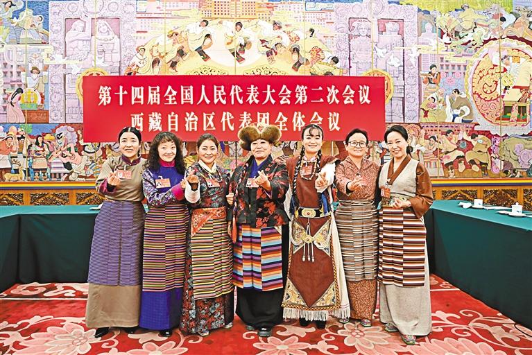 圖為(wei) 西藏全國人大代表中的“七朵金花”在北京人民大會(hui) 堂西藏廳合影留念,並祝福全區婦女同胞“三八”國際勞動婦女節快樂(le) 。
