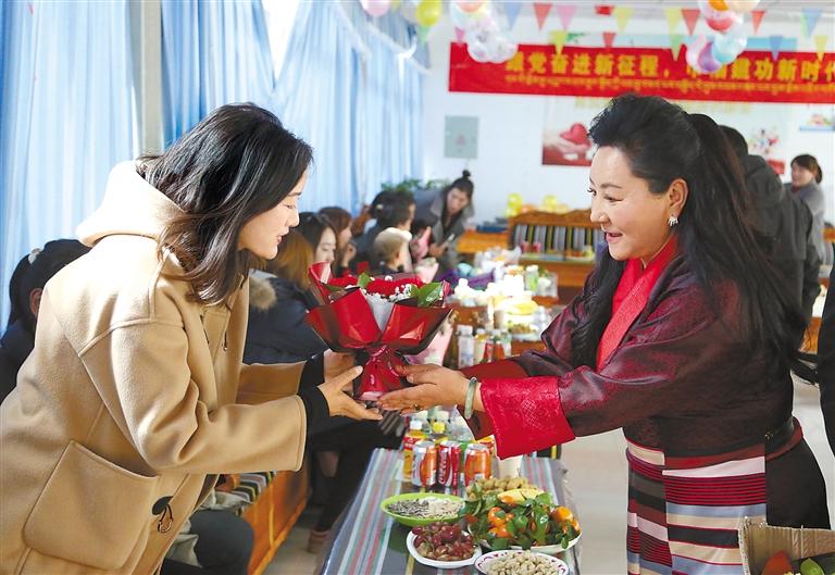 “三八”國際勞動婦女節來臨(lin) 之際,山南市瓊結縣中心醫院組織醫院婦女職工一起慶祝節日。圖為(wei) 瓊結縣中心醫院院長巴桑潘多(右)為(wei) 醫院婦女職工獻上鮮花。 倫(lun) 珠澤仁 洛桑 攝