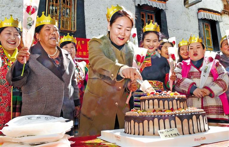 為(wei) 進一步豐(feng) 富社區婦女同胞的精神文化生活,展示社區巾幗風采,3月8日,拉薩市策門林社區和藥王山社區共同舉(ju) 辦了“巾幗心向黨(dang) 奮進新征程‘三八’國際勞動婦女節”活動,轄區婦女歡聚一堂,慶祝節日。圖為(wei) 轄區女性共同切蛋糕慶祝節日。 旦增蘭(lan) 澤 攝
