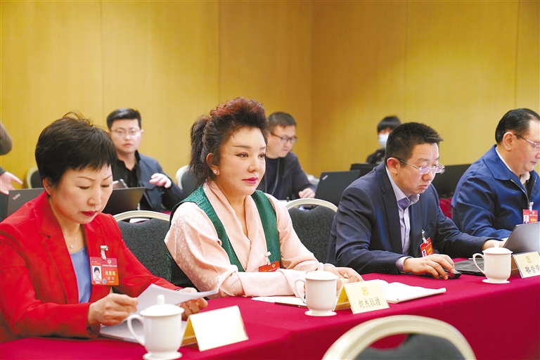 住藏全國政協委員朗傑拉措(中)在少數民族界討論時發言。