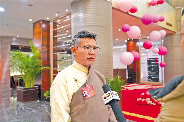 會(hui) 議期間,住藏全國政協委員達瓦頓珠在委員駐地接受媒體(ti) 采訪。